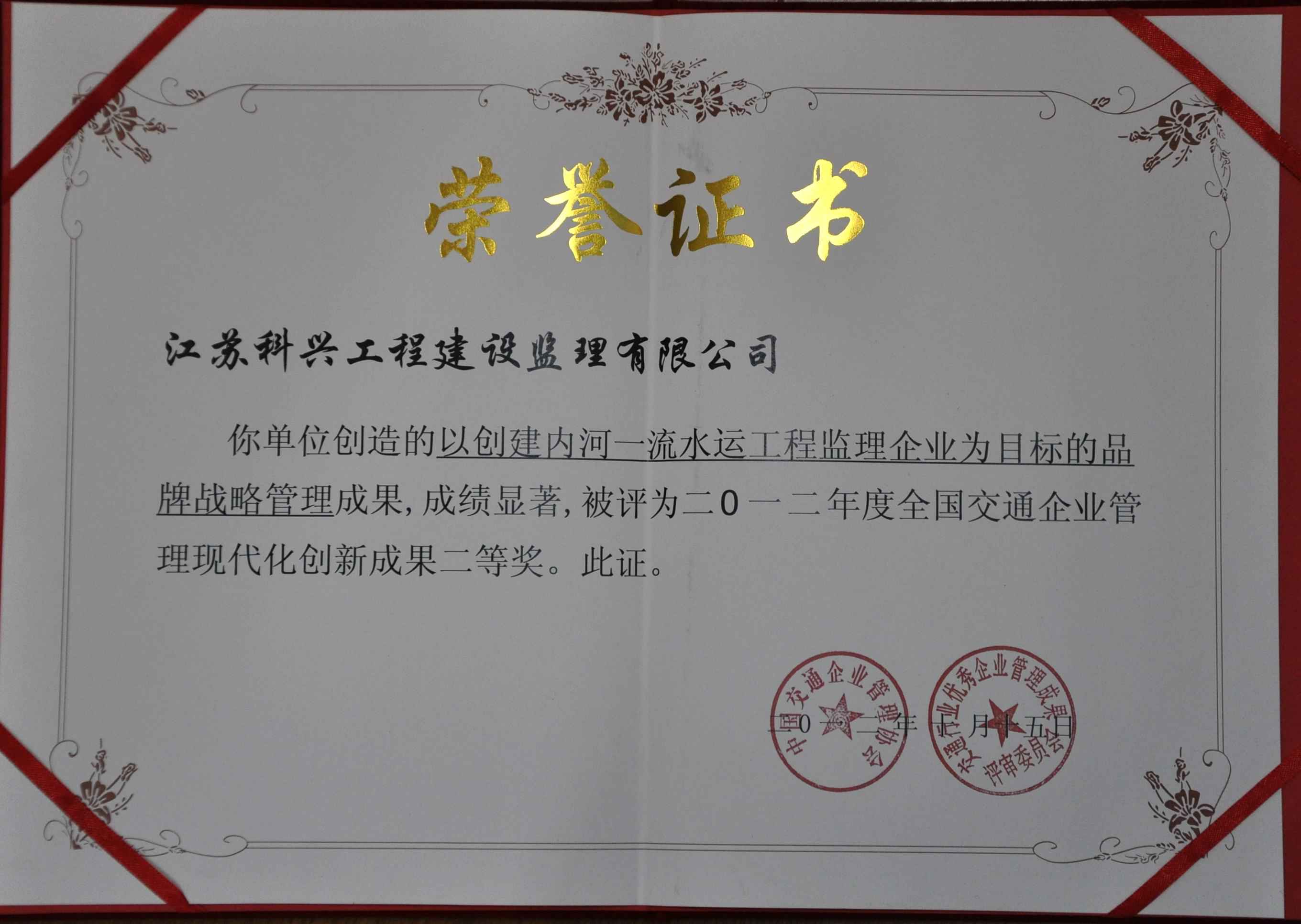 2012年12月1日至2日,2012年全国交通运输企业管理创新年会在北京召开, 公司副总经理张友利参加了会议。会上对2012年度全国交通企业管理现代化创新获奖企业进行了颁奖。其中公司的“以创建内河一流水运工程监理企业为目标的品牌战略管理”成果被评为2012年度全国交通企业管理现代化创新成果二等奖。在此次评选的162项成果中仅有3家监理企业成果获奖。 近年来,公司坚持“以创建内河一流水运工程监理企业为目标”的品牌战略管理,围绕品牌建设,制定创建内河水运工程施工监理品牌企业的战略规划;加快实施内河水运工程人才管理战略;充分发挥国家级科研院所属科技企业优势,创新项目管理机制,建立内河水运施工监理项目管理模版,加强技术研究及总结提炼,促进内河水运建设监理的技术及管理水平提高,为我国内河水运工程建设及行业发展做出贡献;已基本树立内河水运工程施工监理品牌企业的形象。 通过此次获奖,公司进一步在交通行业内展示了自身特色,提高了知名度与影响力。面对成绩,三公(中国)监理公司将戒骄戒躁,与时俱进,团结一致,努力把公司建设成“创新型、学习型、研究型”监理企业。
