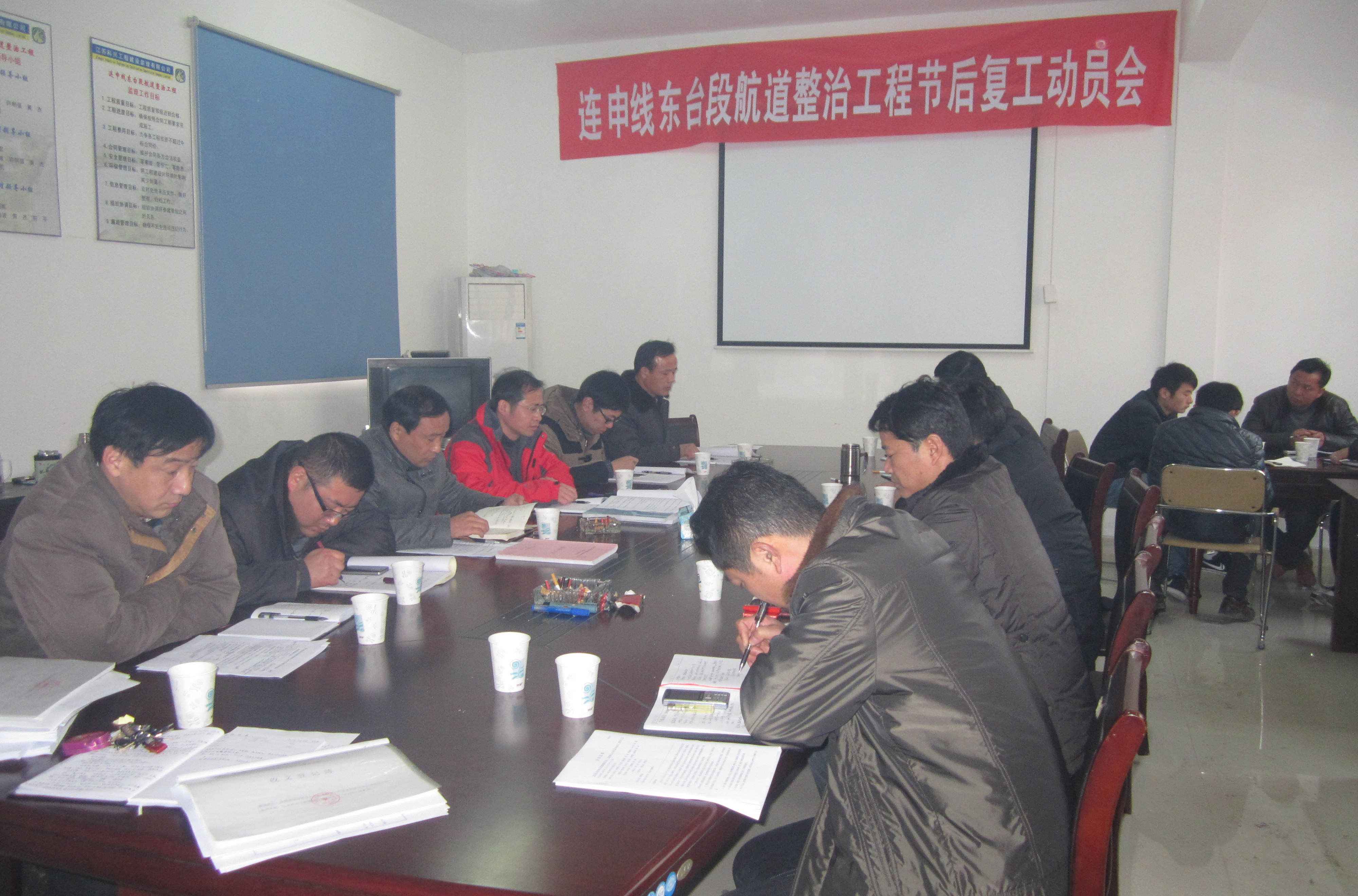2013年2月22日,连申线东台段航道监理组组织召开节后复工动员会,参加会议人员有:项目办领导、项目经理、总工、施工队长以及监理人员。会议就再次明确了工程复工时间;并对现场安全隐患排查及以6月工程交工为目标进行了详细的安排。会议要求各项目部制定详细的剩余工程量进度分解计划,要求细化到各施工班组及每一天;制定考核制度,考核到各班组、每个参建人员,做到日考核,周考核。