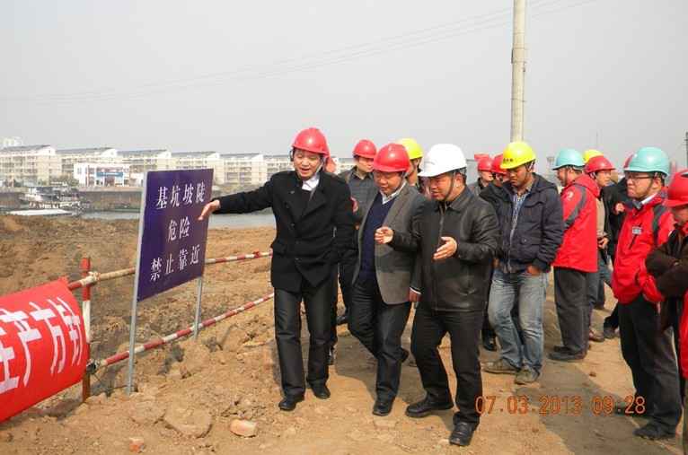 2013年3月7日上午,扬州市交通运输局局长王骏一行在扬州市航道处夏正东处长的陪同下视察施桥船闸下游锚地工程及已通航的施桥三线船闸。施桥三线船闸下游锚地工程为在汛期来临之前完成主体部分,开展了“大干一百天,完成主体墙身”的活动。活动主要三个节点:一、三月底完成全部管桩施工;二、四月二十号完成全部地板施工;三、五月底完成全部墙身砼浇注。施工现场管桩、土方开挖、底板、墙身各项工作繁忙而有序的进行。监理组将协同项目部共同为这一目标努力。(候力文)