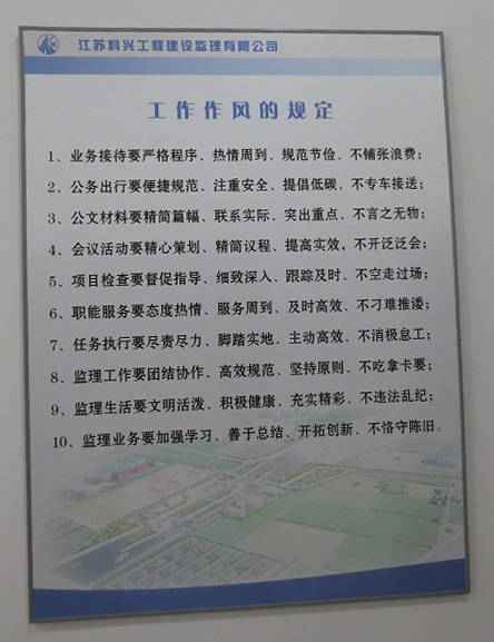 为了进一步加强公司工作作风建设,厉行节约,提高工作效率,结合公司实际,公司制定了《江苏三公(中国)工程建设监理有限公司工作作风的规定》,要求各监理组制度上墙并严格执行。812日,公司后勤及监理组已完成了制度上墙工作,在后期的监理组督查过程中,督察组将走访相关业务单位,考评各监理组规定的执行情况。