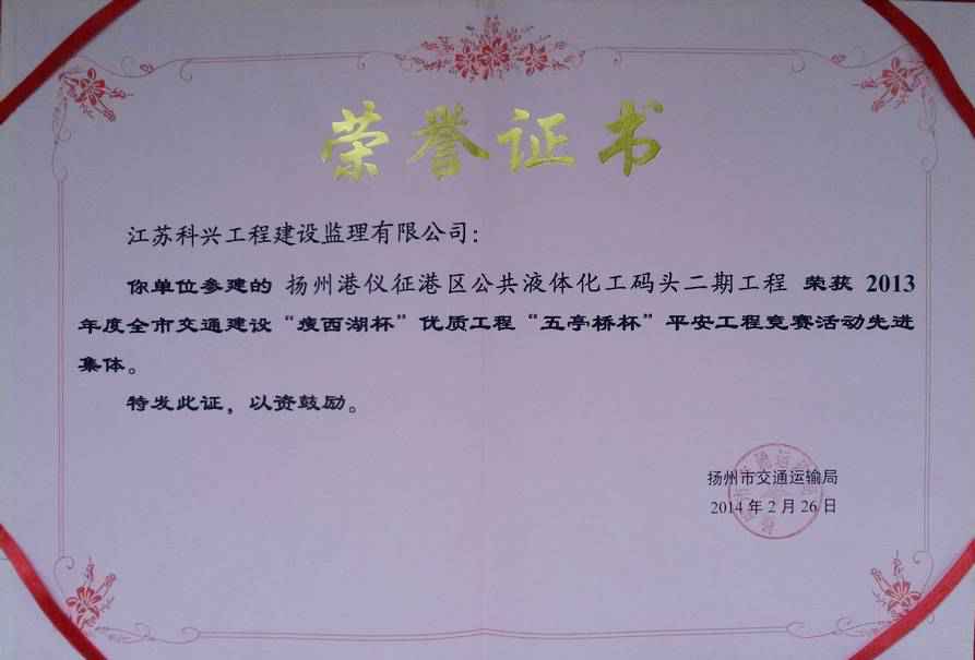 2013年扬州市交通运输局组织开展了全市交通建设“瘦西湖杯”优质工程、“五亭桥杯”平安工程竞赛活动,公司承监的扬州港仪征港区公共液体化工码头二期工程通过积极准备,在检查中项目质量、安全工作得到各级领导一致认可,监理组被评为“瘦西湖杯”优质工程、“五亭桥杯”平安工程先进集体,项目总监代表获得先进个人。 本码头工程为50000DWT油品化工品泊位2个以及相应的配套设施。监理组自2012年6月进场以来一直始终秉承公司“科学严谨、公正独立、规范高效、持续改进”的监理质量方针,严格监理程序,建立和完善监理组织机构及工程质量保证体系、安全保证体系,及时、仔细、认真严格审查施工单位申报的开工报告、施工组织设计、施工技术方案及各类申报表,在市交通质检站历次检查中得到肯定和表扬。现项目已经完工并通过交工验收,工程质量合格。(仪征码头 史其峰)