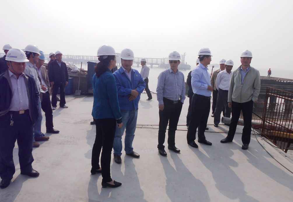 10月23日上午,省交通运输厅港口局朱培德局长一行八人,在泰兴市政府领导、泰兴港口局副局长樊晖等人的陪同下,到我公司在监项目金燕仓储化工码头施工现场检查指导工作。 检查组一行实地查看了码头施工现场,听取了项目施工、监理单位的现场汇报,了解了化工码头改造工程的特点,朱局长一行对码头施工、监理工作给予充分认可。朱局长对大家说,江苏三公(中国)监理公司作为大型监理单位,做水运工程很专业;同时鼓励大家要高度现场施工的安全工作,层层落实责任,扎实推进现场工作,为泰兴码头建设做出积极贡献。(三公(中国)三部 李宁) |