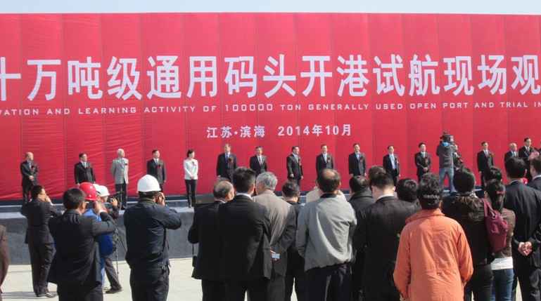| 2014年10月28日滨海港10万吨通用码头彩旗飘扬,11点38分,在万众期待的目光中,随着盐城市委书记朱克江宣布开航, “凯王星”号货轮发出浑厚的汽笛声。霎那间,礼乐合奏,鞭炮齐鸣,人群沸腾。滨海港10万吨级通用码头顺利进行开港试航。 南京水利科学研究院喻国华和陆培东教授,公司副总经理张友利作为特邀嘉宾出席了这次活动。 | |