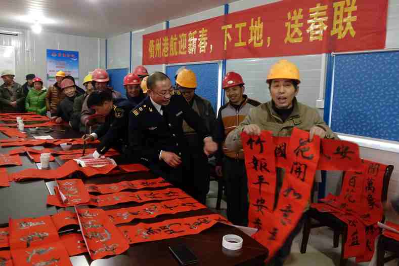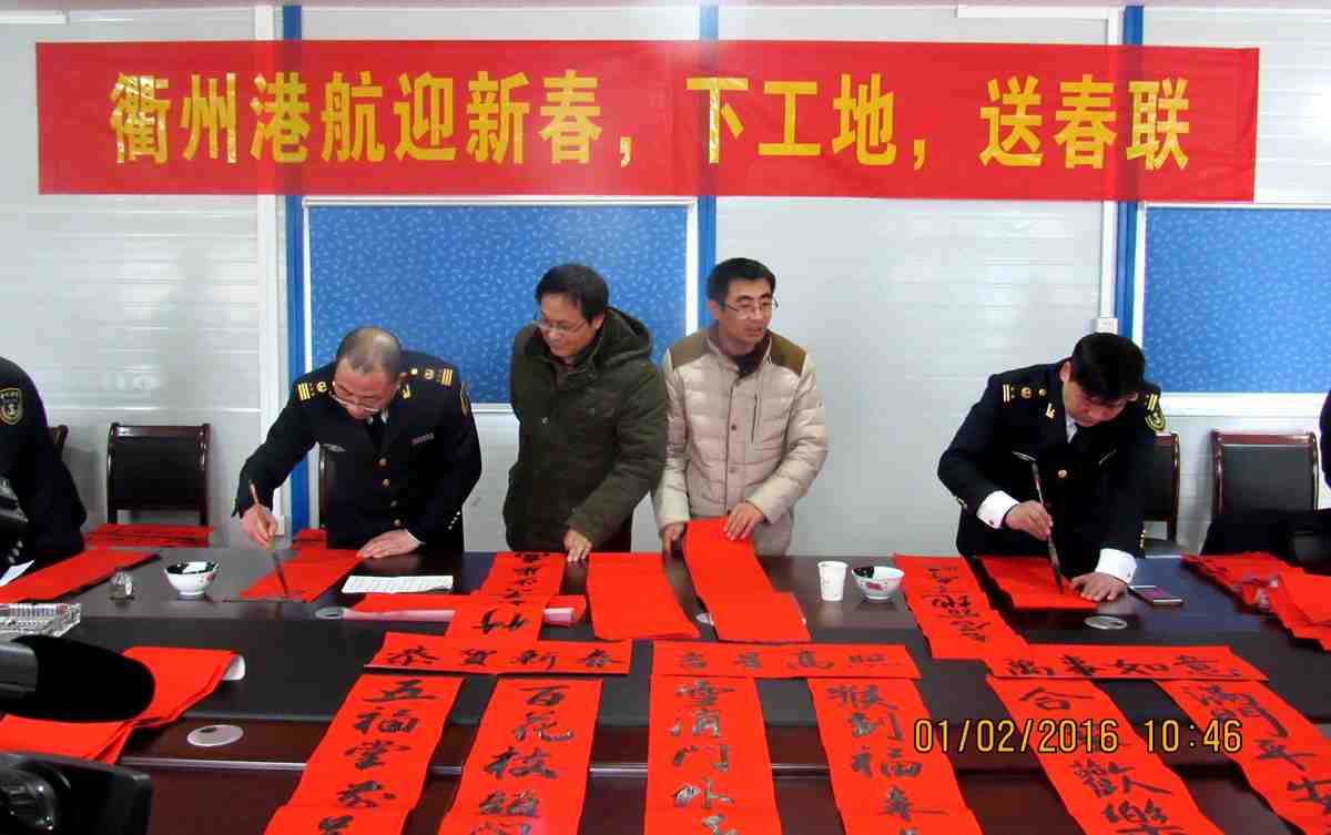 | 2016年2月1日上午,衢州市港航局周局长带队,走进塔底船闸施工现场,开展了“迎新春,下工地,送春联” 活动。为奋战在一线的监理、施工人员挥毫泼墨,书写对联,送来吉祥与祝福。 在两个多小时的活动中,现场气氛热烈,周局长等4名港航局领导现场书写对联,并亲手发送到民工兄弟手中,传递着爱心和对新年的美好祝福,寓意猴年一切顺利,为施工现场增添了浓浓的“年味”。 借此活动,也预祝塔底船闸工程来年“千般顺、万事兴、四季都平安!”(塔底船闸工程总监办) | |