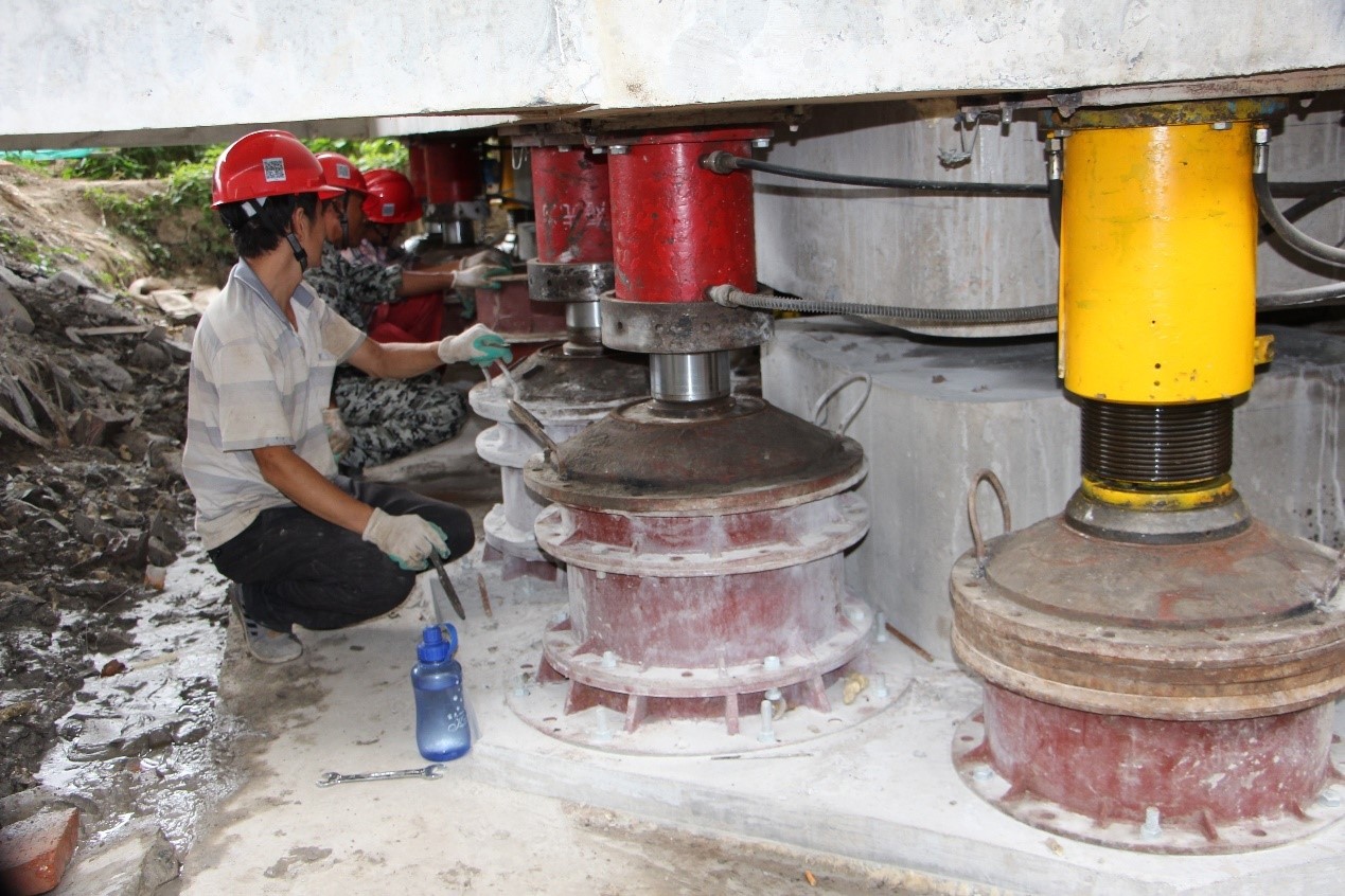 苏申内港线江浦路吴淞江大桥顶升改造工程是公司承接的第二个桥梁顶升项目,也是首个大吨位顶升项目,该桥梁主桥单次顶升重量2.2万吨,引桥单幅重量5000吨,为目前国内单次顶升重量最大的斜拉桥。 吴淞江大桥位于江苏昆山跨吴淞江(即苏申内港线)处,因三级航道整治通航净空需要,桥梁需整体抬高1.87米,方案采用先引桥再主桥整体顶升工艺,引桥为7跨简支板梁桥,主桥为2跨连续梁独塔斜拉桥。整个项目需投入各类千斤顶300余台套,液压泵站及PLC控制系统40余台套,顶升前需进行复杂的反力、限位结构施工,顶升到位后需对原截断的墩柱进行接高和加粗,施工工艺复杂,技术难度极高,给施工管理带来极大的挑战。 监理部与施工单位积极配合协同开展工作,参加方案讨论、标准制定,同步开展检查、工序验收等工作。经过2个月的精心准备和多个阶段的验收,南引桥左幅7跨同步顶升已具备条件,8月1日,本工程第一次顶升施工正式开始,各岗位监理按分工投入到紧张的监测、检查、旁站中,现场气氛热烈、指挥有序,桥梁按照预定行程逐渐抬高,在后续的数天内,全体监理人员将坚守岗位,实时监管,及时反馈,确保本阶段顶升取得圆满成功! |
