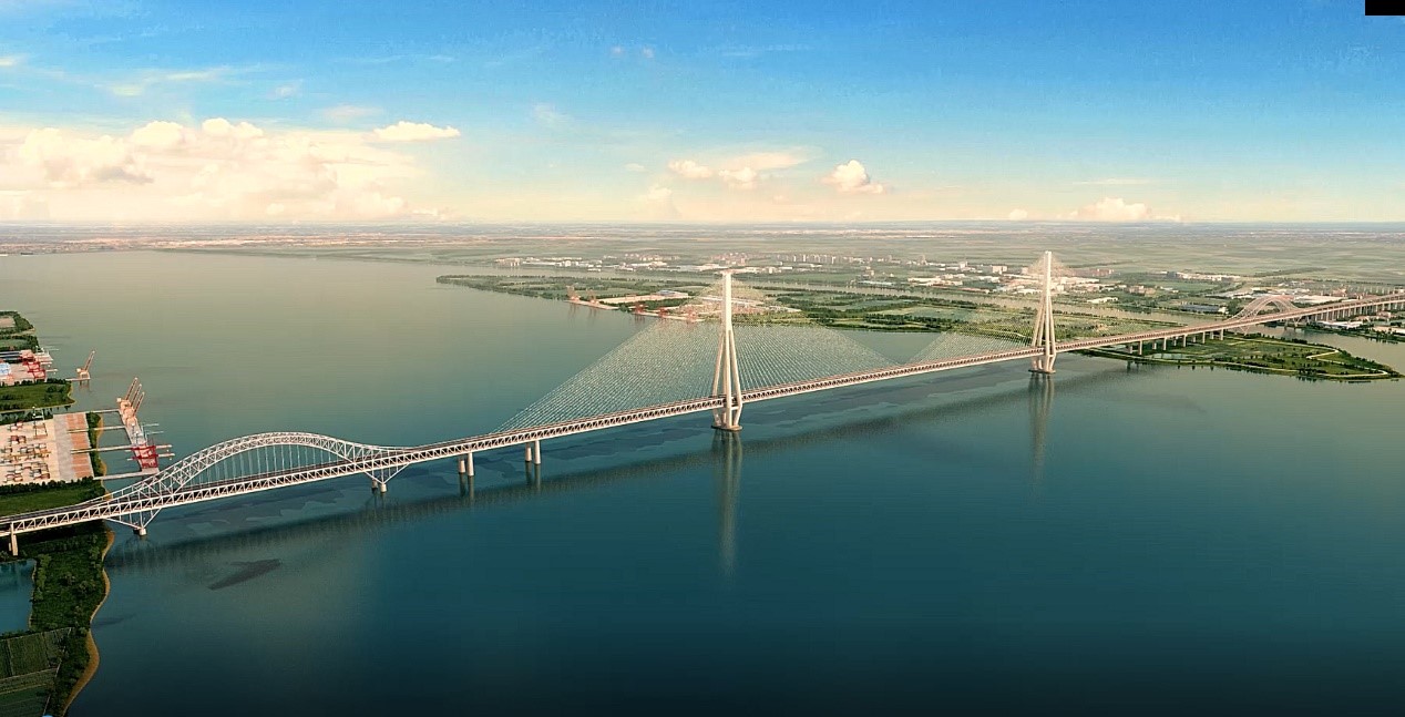常泰长江大桥连接常州和泰州两市,全长约37.3公里,其中跨江大桥公铁合建段长5.3公里,采用“高速公路+城际铁路+普通公路”方式过江,上层桥面布置为6车道高速公路,设计时速100公里,下层桥面上游侧布置为2线城际铁路,设计时速200公里,下层桥面下游侧布置4车道普通公路,设计时速80公里。主航道采用(142+490+1176+490+142)米斜拉桥,天星洲、录安洲专用航道采用(169.5+388+169.5)米钢桁拱桥。录安洲非通航孔桥采用3×124米连续钢桁梁,两岸合建段引桥采用混凝土梁桥。其中主航道桥是世界上最大跨度的公铁两用斜拉桥,专用航道桥是世界上最大跨度的公铁两用钢拱桥。