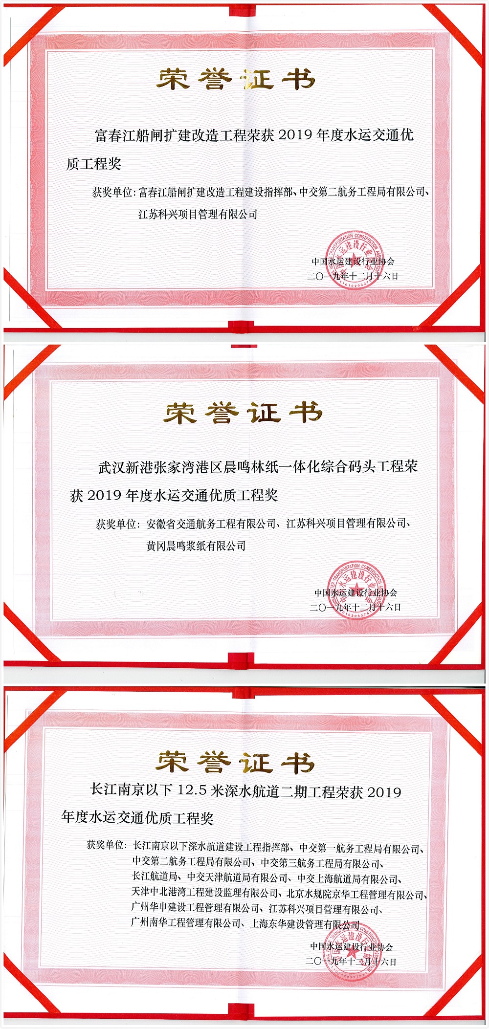 近日,由现金三公官网承监的富春江船闸扩建改造工程、武汉新港张家湾港区晨鸣林纸一体化综合码头工程、长江南京以下12.5米深水航道二期工程荣获2019年度水运交通优质工程奖。