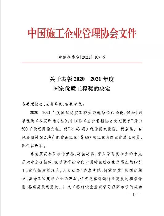 2021年12月6日,2020-2021年度国家优质工程奖评选结果揭晓,公司参建的长江南京以下12.5米深水航道二期工程、恒逸(文莱)PMB石油化工项目荣获国家优质工程奖金奖,京杭运河船闸扩容工程施桥三线船闸工程、富春江船闸扩建改造工程荣获国家优质工程奖!